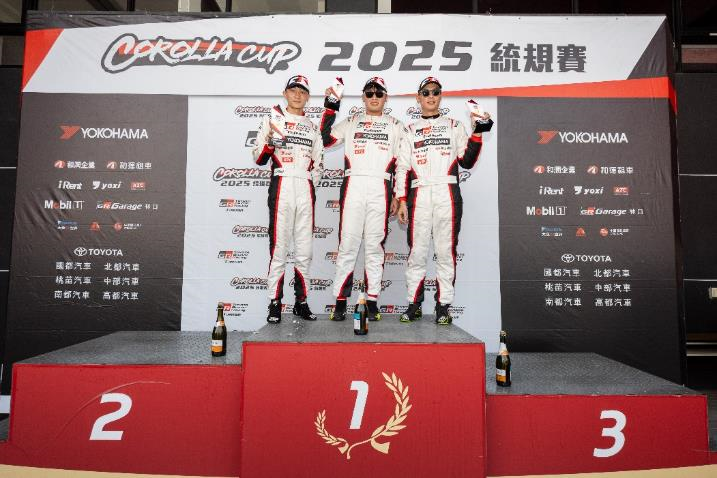 Corolla Cup 2025統規賽最終站第三回合冠軍謝坤廷(中)、亞軍林永程(左)、季軍程志熙(右) ,於頒獎台合影留念。