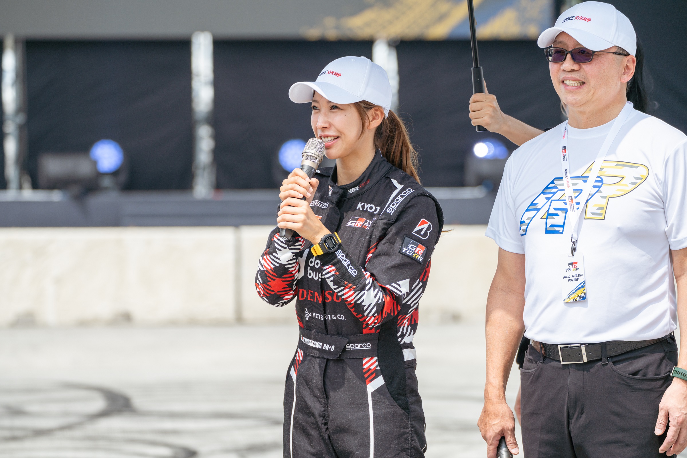 ROOKIE Racing平川真子選手駕駛GR86帥氣甩尾演出,精準操駕引爆全場歡呼,坐在副駕的和泰汽車蘇純興總經理開心與眾人揮手打招呼。