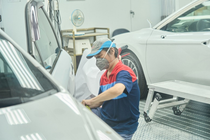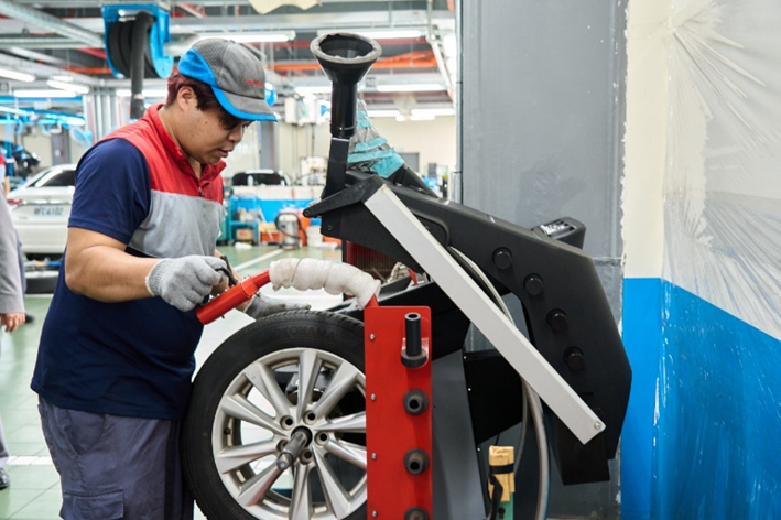 在智慧化服務上,和泰成立「流程改善室」,推動 Smart Workshop,以平板電腦取代紙本,將定保時間從平均117分鐘縮短至89分鐘,全面提升作業效率與顧客體驗。同時,經銷商積極導入 AI 噴塗機器人、電動輔具與降溫設備,有效減輕技師身體負擔,更率先業界引進水性金油,降低揮發性溶劑對健康的危害,展現對員工健康與工作安全的長期承諾。